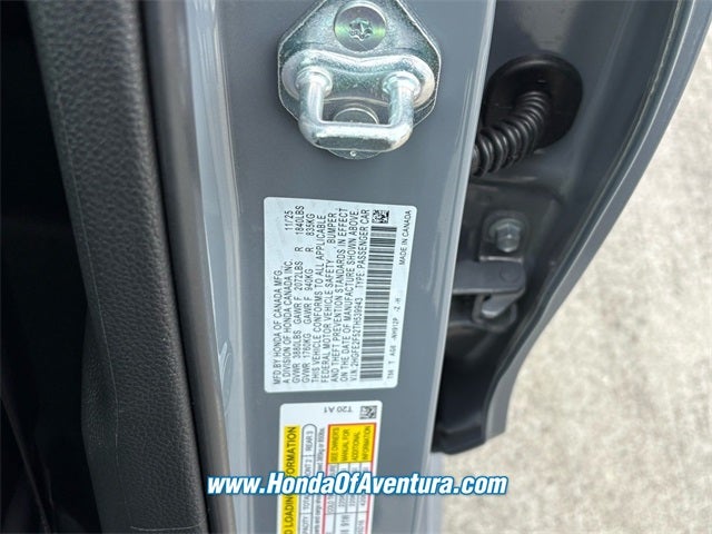 Honda of Aventura is proud to present you with another True Market Priced Vehicle. This 2026 Honda Civic Sport is loaded with the following Factory Options: Black Artificial Leather Black Artificial Leather, 4-Wheel Disc Brakes, 8 Speakers, ABS brakes, Adaptive Cruise Control: Adaptive Cruise Control (ACC) with Low-Speed Follow, Air Conditioning, Alloy wheels, AM/FM radio, Apple CarPlay/Android Auto, Auto High-beam Headlights, Automatic temperature control, Blind Spot Information (BSI) System warning, Brake assist, Bumpers: body-color, Cloth/Leatherette Seating Surfaces, Delay-off headlights, Driver door bin, Driver vanity mirror, Dual front impact airbags, Dual front side impact airbags, Electronic Stability Control, Emergency communication system: HondaLink, Exterior Parking Camera Rear, Four wheel independent suspension, Front anti-roll bar, Front Bucket Seats, Front Center Armrest, Front reading lights, Fully automatic headlights, Heated door mirrors, Illuminated entry, Knee airbag, Leather Shift Knob, Leather steering wheel, Low tire pressure warning, Occupant sensing airbag, Outside temperature display, Overhead airbag, Panic alarm, Passenger door bin, Passenger vanity mirror, Power door mirrors, Power steering, Power windows, Radio data system, Radio: 180-Watt Audio System, Rear anti-roll bar, Rear seat center armrest, Rear side impact airbag, Rear window defroster, Remote keyless entry, Security system, Speed control, Speed-sensing steering, Split folding rear seat, Steering wheel mounted audio controls, Tachometer, Telescoping steering wheel, Tilt steering wheel, Traction control, Trip computer, and Wheels: 18 Gloss Black Alloy!! 31/39 City/Highway MPG